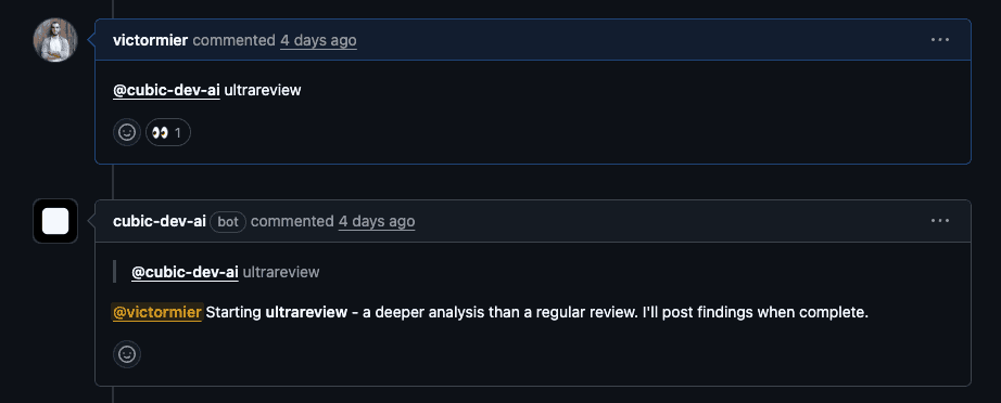 After opening a PR, mention @cubic-dev-ai ultrareview in a new comment in the PR: